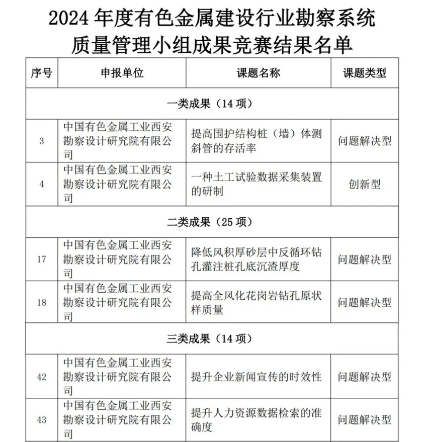 近日,中國有色金屬建設(shè)協(xié)會公布了2024年度有色建設(shè)行業(yè)勘察系統(tǒng)質(zhì)量管理小組成果競賽活動(部級)獲獎(jiǎng)項(xiàng)目名單,西安勘察設(shè)計(jì)院組織申報(bào)的《提高圍護(hù)結(jié)構(gòu)樁(墻)體測斜管的存活率》《一種土工試驗(yàn)數(shù)據(jù)采集裝置的研制》等6項(xiàng)成果,分獲一、二、三獎(jiǎng)。