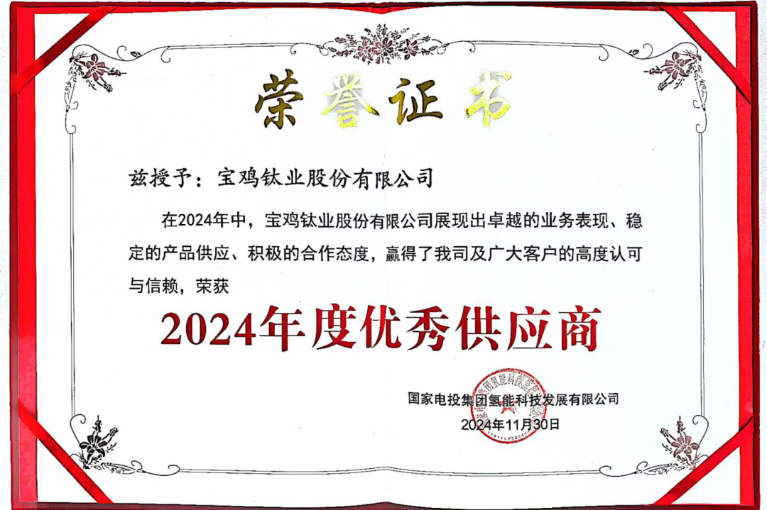近日,在國家電投集團(tuán)氫能科技發(fā)展有限公司(以下簡稱國氫科技)供應(yīng)商評比中,寶鈦股份從百余家供應(yīng)商中脫穎而出,榮獲“優(yōu)秀供應(yīng)商”稱號,且為五家“優(yōu)秀供應(yīng)商”中唯一一家鈦材供應(yīng)商。