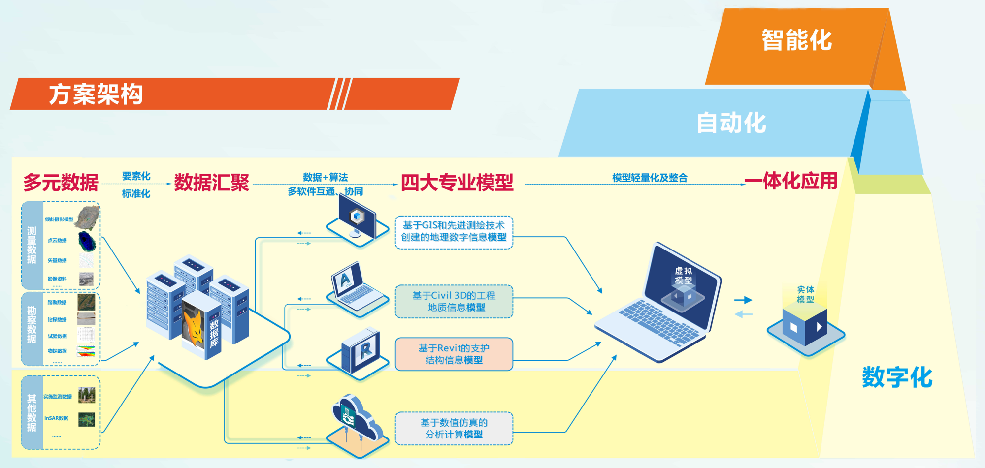 該方案以工程數(shù)據(jù)中心為核心,創(chuàng)新性地集成了地質(zhì)信息模型、結(jié)構(gòu)分析模型、施工模擬模型和運維監(jiān)測模型四大數(shù)字化模塊,實現(xiàn)了從數(shù)據(jù)采集、模型構(gòu)建到智能應用的完整閉環(huán)。經(jīng)多個重大項目驗證,該技術(shù)使巖土工程方案設計效率提升40%,施工風險預警準確率達92%,有效解決了傳統(tǒng)工程中數(shù)據(jù)孤島、協(xié)同困難等痛點問題。