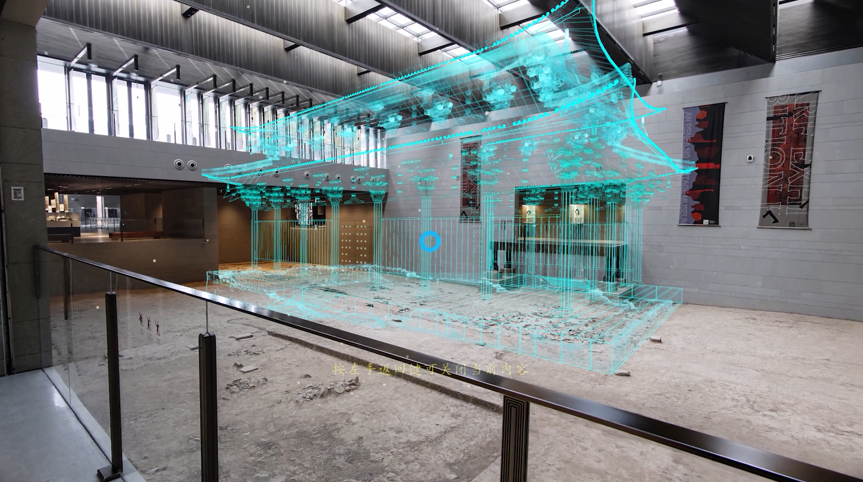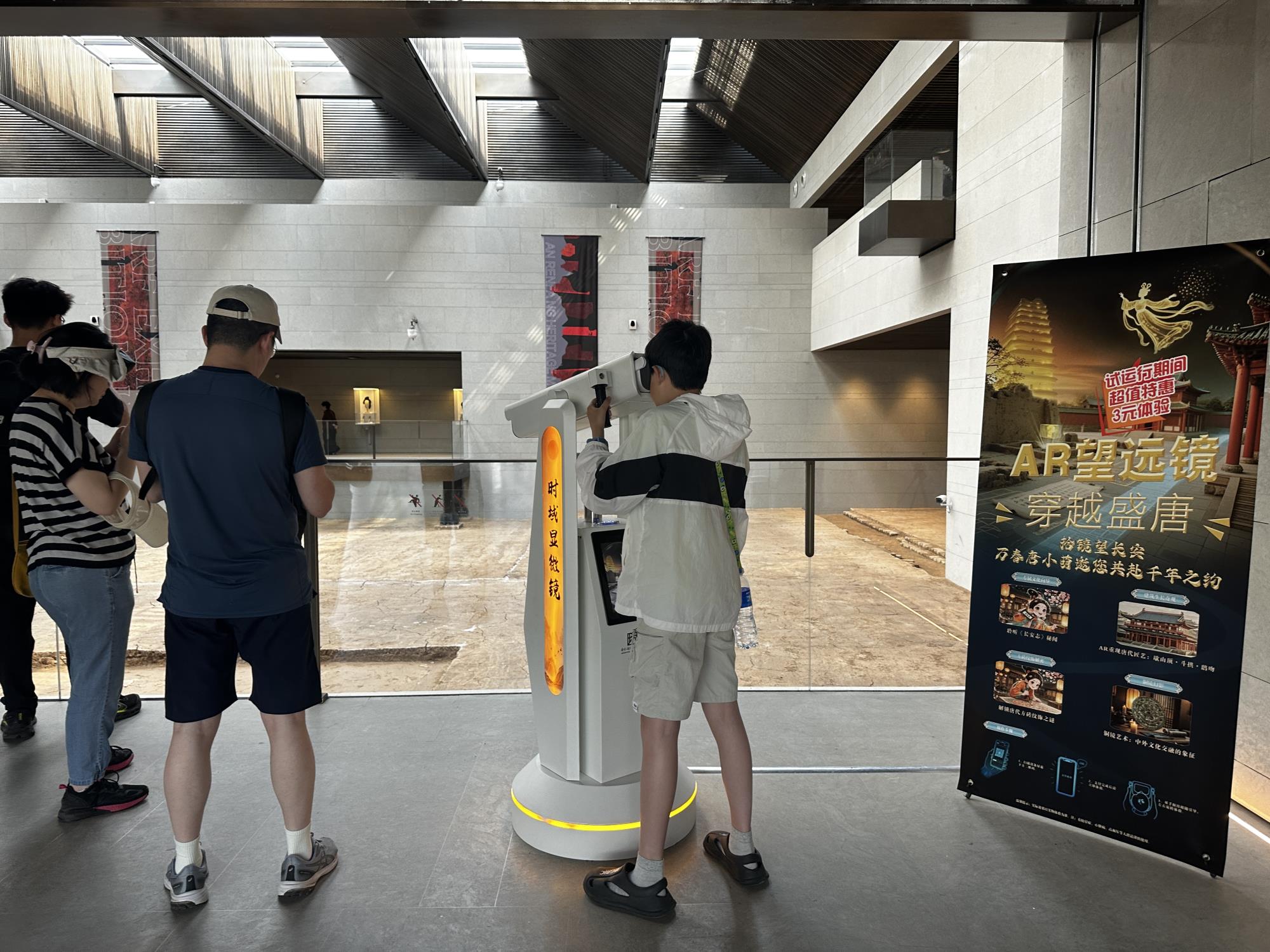 在場(chǎng)館內(nèi)遺址展示區(qū),游客只需通過手機(jī)掃碼,便可在“AI唐小萌”的帶領(lǐng)下暢游無阻,輕松獲取豐富的展品資料及其背后的歷史故事。游客手持AR望遠(yuǎn)鏡,對(duì)準(zhǔn)遺址標(biāo)識(shí),蓮花方磚、銅鏡等文物的復(fù)原展示及科普講解便會(huì)躍然眼前。俯瞰下方遺址,古老的唐代建筑遺跡與現(xiàn)代化的AR復(fù)原影像交相輝映,方寸之間盡顯盛唐之美。