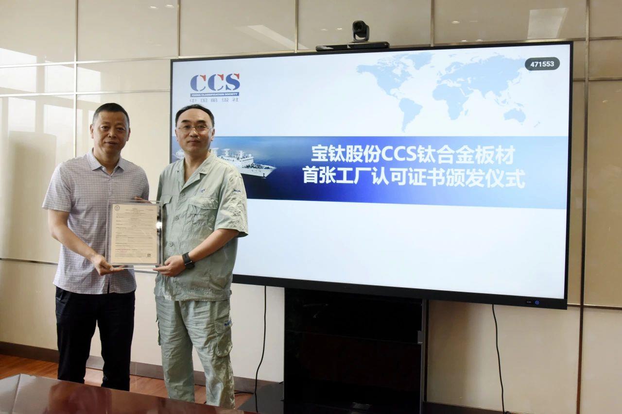 5月14日,中國船級社(CCS)鈦合金板材首張工廠認(rèn)可證書頒發(fā)儀式在寶鈦股份舉行。寶鈦股份副總經(jīng)理陳峰、CCS天津分社副總經(jīng)理孫政策出席儀式,質(zhì)量部主任馬勇軍主持儀式。