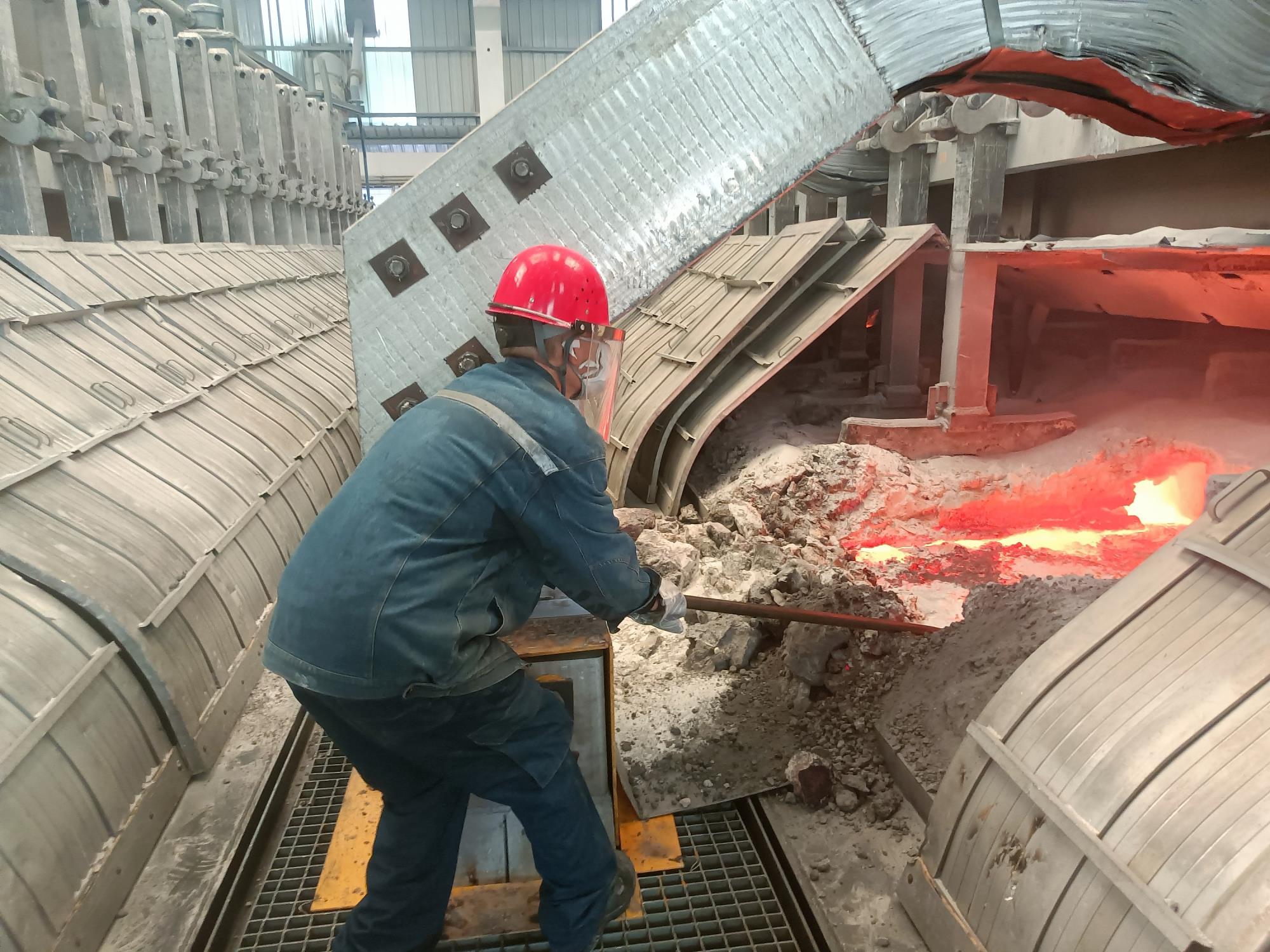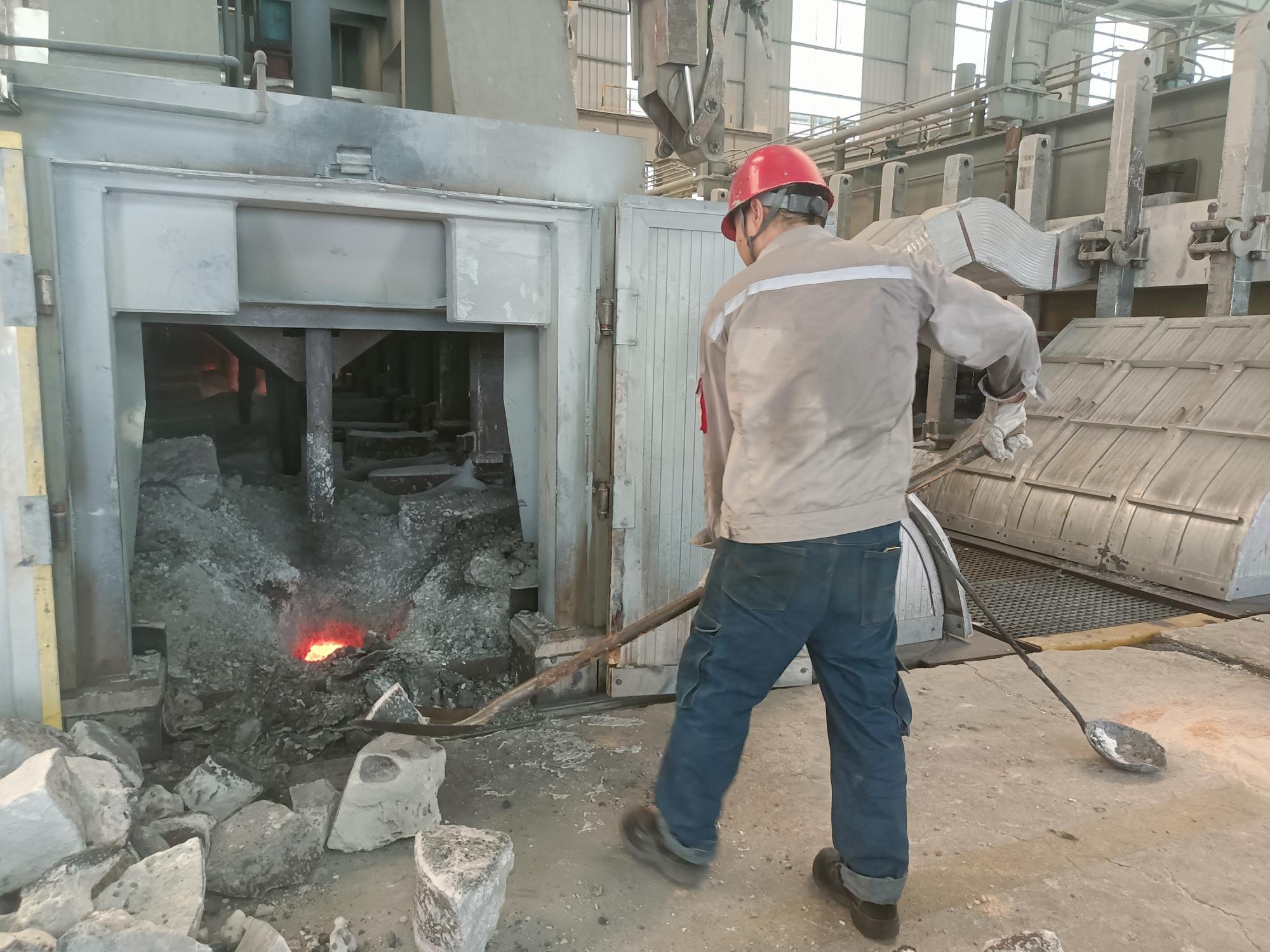 生產(chǎn)現(xiàn)場,500KA電解槽排列成陣,如同一條條沉默的鋼鐵巨龍,槽內(nèi)鋁液翻涌、發(fā)出低沉的嗡鳴。工人們身著厚厚的阻燃工作服、頭戴安全帽,汗水早已浸透衣背,在厚重的工裝上洇開大片深色鹽漬。每一次揮動鐵鍬,每一次認真巡視,每一次記錄數(shù)據(jù),構(gòu)成一幅與高溫對抗的堅韌畫面。
