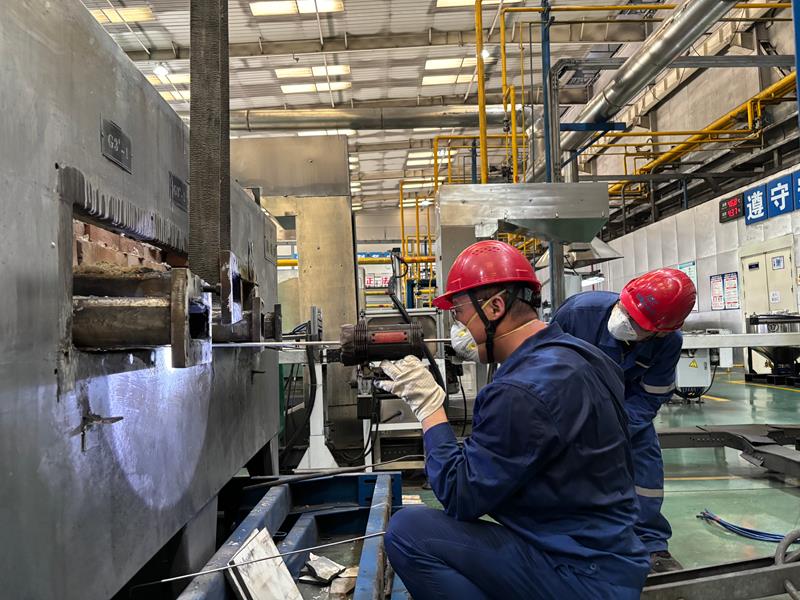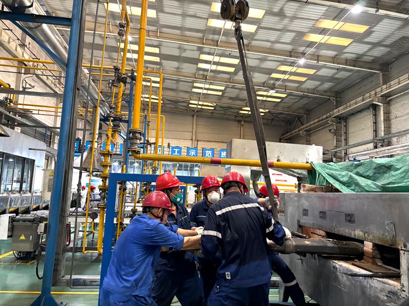 爐管更換是一項兼具繁重體力與精細技術(shù)的綜合性任務(wù),不僅需要拆卸爐管、徹底清理爐膛,還要精準安裝新爐管并完成設(shè)備調(diào)試。既要克服重型部件搬運的強度挑戰(zhàn),又需要確保每一步裝配的毫米級精度,最終實現(xiàn)設(shè)備高效穩(wěn)定運行。在悶熱如蒸籠的作業(yè)環(huán)境中,員工們揮汗如雨,卻始終斗志昂揚。“雖然天氣熱,但生產(chǎn)任務(wù)不能耽誤,我們早一分鐘完成,后續(xù)生產(chǎn)就多一份保障!”員工樸實的話語詮釋了鉬粉分廠員工的責任與擔當。