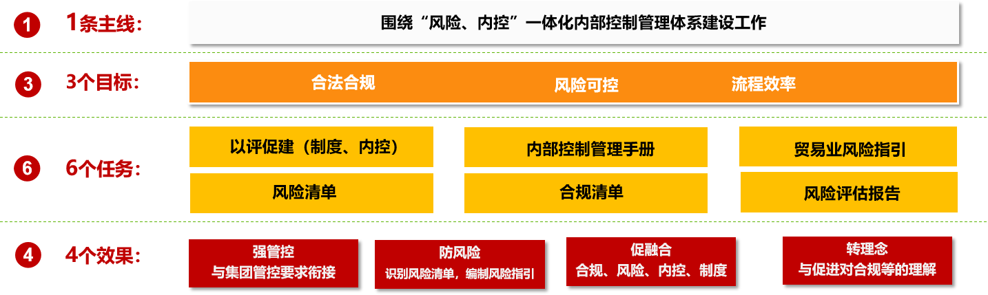 高標準規(guī)劃:緊扣“風險、內(nèi)控一體化建設”這一主線,按照“1364”思路系統(tǒng)推進——錨定合法合規(guī)、風險可控、管控高效三大目標,一體完成內(nèi)控診斷報告、風險清單、合規(guī)清單、風險評估報告、內(nèi)部控制手冊、貿(mào)易業(yè)務風險指引六項任務,全面達成強管控、防風險、促合規(guī)、轉(zhuǎn)理念四項成效,為企業(yè)高質(zhì)量發(fā)展筑牢堅實屏障。