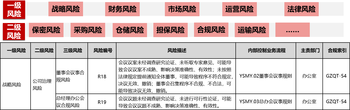 風險數(shù)據(jù)庫與合規(guī)數(shù)據(jù)庫如同內(nèi)部控制的“雙引擎”,共同驅(qū)動企業(yè)穩(wěn)健前行。以全面復盤風險業(yè)務為基礎,完善建立風險數(shù)據(jù)庫,構(gòu)建起“戰(zhàn)略—市場—運營—財務—法律”五維清單,并與流程框架、制度體系、法規(guī)庫精準映射,實現(xiàn)風險“顆粒化”管理。合規(guī)數(shù)據(jù)庫則按“法律法規(guī)—部委規(guī)章—公司制度”三級架構(gòu),形成動態(tài)合規(guī)索引,覆蓋全部適用規(guī)范。兩庫實時聯(lián)動:風險識別階段可及時比對合規(guī)要求,整改階段又能反向校驗制度缺口,真正做到“風險可見、合規(guī)可循、整改可量”,為內(nèi)部控制提供一體化支撐,并充分滿足監(jiān)管部門的審計、檢查與持續(xù)合規(guī)需求。