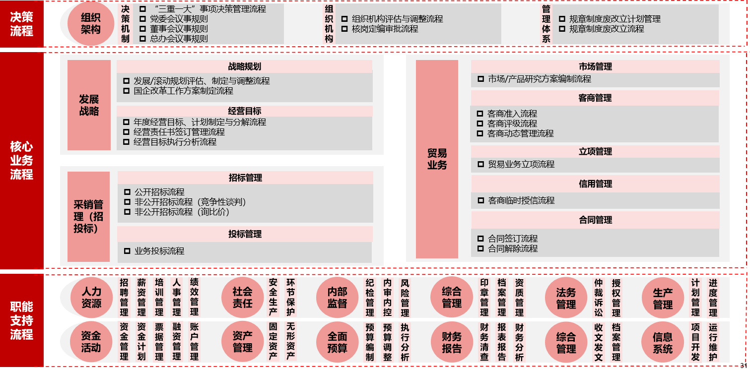 公司以“流程地圖”與“風險防線”雙輪驅(qū)動,夯實內(nèi)部控制底座。一方面,依托《內(nèi)部控制管理手冊》,沿著“管理制度化、制度流程化、流程表單化、表單信息化”的主線,將組織架構(gòu)、人力資源、資金活動、貿(mào)易業(yè)務等關(guān)鍵領(lǐng)域全部納入分級流程框架,用端到端流程圖標明主責部門、起始節(jié)點、關(guān)鍵表單和審批要點,配套權(quán)限指引,把隱性流程顯性化、零散流程系統(tǒng)化,成為業(yè)務運行的“導航圖”和后續(xù)信息化的藍本。另一方面,緊扣中央貿(mào)易“十不準”,以“誰經(jīng)營、誰負責”為準繩,發(fā)布《貿(mào)易業(yè)務風險指引》,用一張“全景圖”貫通風險識別、評估、應對、監(jiān)督:先識別戰(zhàn)略、市場、信用、合規(guī)、操作等關(guān)鍵風險,再厘清管理界面、業(yè)務模式、制度框架與權(quán)責分工,將計劃、市場、客商、采銷等核心環(huán)節(jié)嵌入流程,并統(tǒng)一檔案目錄,實現(xiàn)業(yè)務留痕、風險可追溯。流程與風險兩大體系相互映射、動態(tài)聯(lián)動,風險管理由事后補救變?yōu)槭虑皩Ш?,為企業(yè)高質(zhì)量發(fā)展提供實時預警、精準糾偏的“安全駕駛艙”。