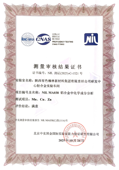 近日,榆林新材料集團(tuán)研發(fā)中心鋁合金中化學(xué)成分分析、鋁合金棒材室溫拉伸測(cè)定、粉末粒度分析(激光衍射法)測(cè)定三個(gè)項(xiàng)目順利通過國(guó)家CNAS實(shí)驗(yàn)室測(cè)量審核能力驗(yàn)證,評(píng)價(jià)結(jié)果均為“滿意”,并獲得能力驗(yàn)證證書,證明其檢測(cè)技術(shù)能力已符合中國(guó)合格評(píng)定國(guó)家認(rèn)可委員會(huì)(CNAS)實(shí)驗(yàn)室認(rèn)可要求。