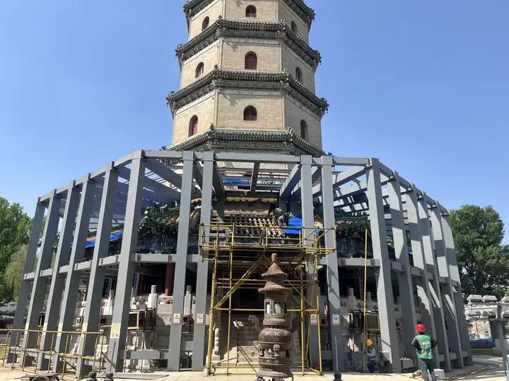 “好比給珍貴瓷器穿護(hù)甲,卻不允許碰到瓷面?!表?xiàng)目負(fù)責(zé)人白延這樣比喻。傳統(tǒng)腳手架在這里行不通——且不說塔身造型復(fù)雜,單是《文物保護(hù)工程管理辦法》中“古建筑嚴(yán)禁設(shè)置永久性拉接點(diǎn)”的規(guī)定,就讓常規(guī)手段全部失效。