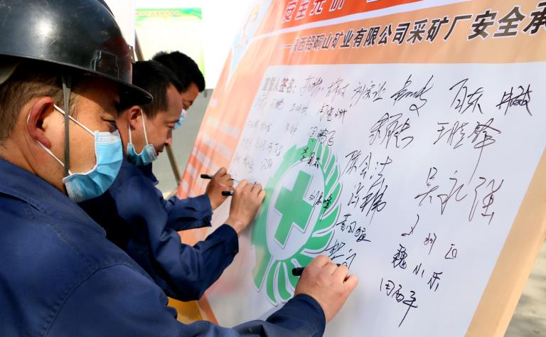 開展儀式上,公司采礦廠及兩個外包作業(yè)項目部50余名生產(chǎn)骨干集體簽名承諾安全,并作出莊嚴(yán)宣誓?!拔业陌踩邑?fù)責(zé),工友的安全我有責(zé),公司的安全我盡責(zé)……”錚錚誓言回聲嘹亮,表達(dá)著對生命的敬畏,對責(zé)任的擔(dān)當(dāng)。