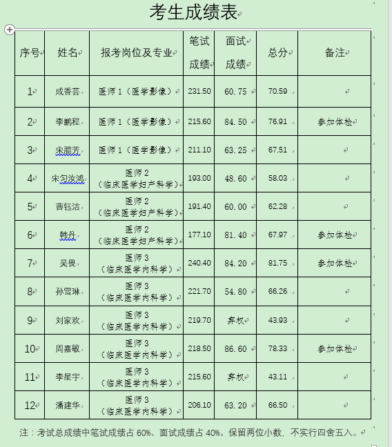 西北有色醫(yī)院2020年省屬事業(yè)單位公開招聘面試環(huán)節(jié)已經(jīng)結(jié)束,依據(jù)《事業(yè)單位人事管理條例》《陜西省事業(yè)單位公開招聘工作人員實施辦法》及2020年陜西省省屬事業(yè)單位公開招聘工作人員公告要求,考試總成績,按照與崗位招聘計劃1:1的比例從高分到低分確定參加體檢人員?,F(xiàn)將有關(guān)事項公告如下: