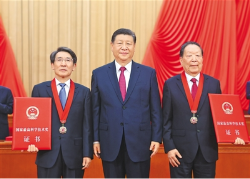 六月二十四日,全國科技大會、國家科學(xué)技術(shù)獎勵大會和中國科學(xué)院第二十一次院士大會、中國工程院第十七次院士大會在北京人民大會堂隆重召開。中共中央總書記、國家主席、中央軍委主席習(xí)近平向獲得二〇二三年度國家最高科學(xué)技術(shù)獎的武漢大學(xué)李德仁院士(右)和清華大學(xué)薛其坤院士(左)頒獎。