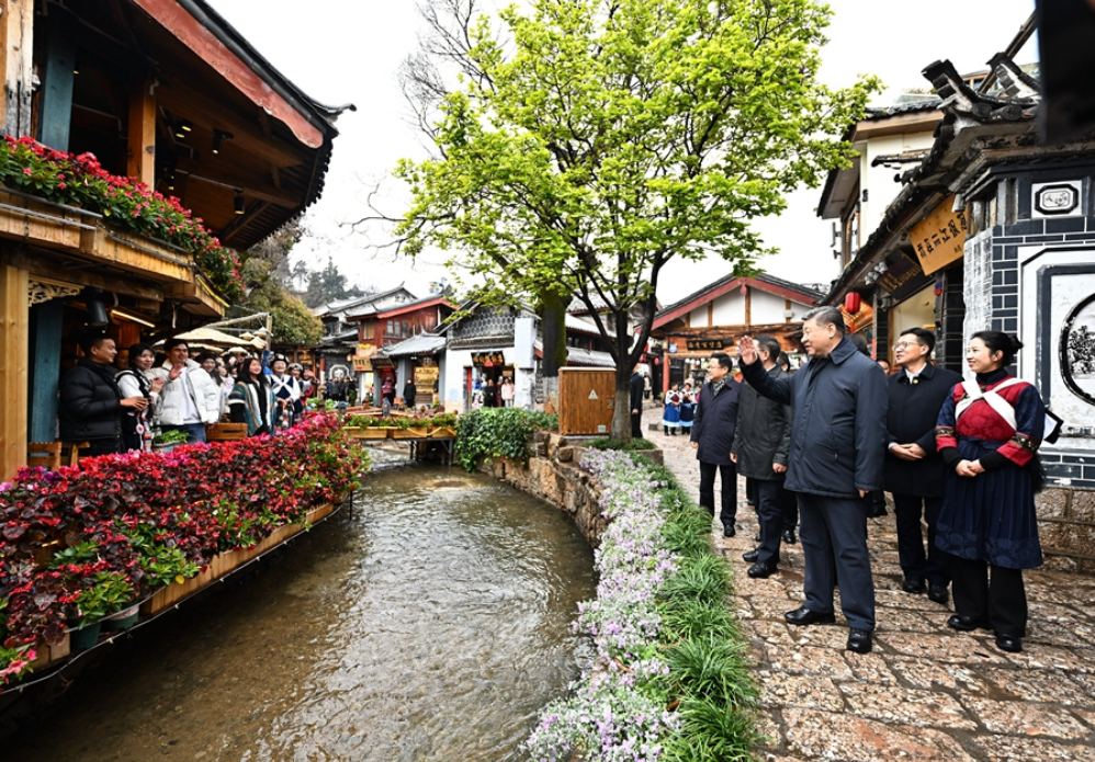 麗江古城有800多年歷史,被列入世界文化遺產(chǎn)名錄。一場(chǎng)春雪過(guò)后,麗江游人如織。習(xí)近平來(lái)到這里,詳細(xì)了解古城營(yíng)建歷史、納西族民居特色和當(dāng)?shù)匚幕z產(chǎn)保護(hù)利用、推動(dòng)文旅融合發(fā)展等情況。居民和游客見(jiàn)到總書記十分興奮,爭(zhēng)相問(wèn)好,有的還彈奏樂(lè)器、載歌載舞歡迎總書記。習(xí)近平頻頻與大家互動(dòng)交流,了解商鋪經(jīng)營(yíng)狀況和游客感受。他要求當(dāng)?shù)靥幚砗帽Wo(hù)和發(fā)展的關(guān)系,讓這座美麗的古城煥發(fā)新的光彩。