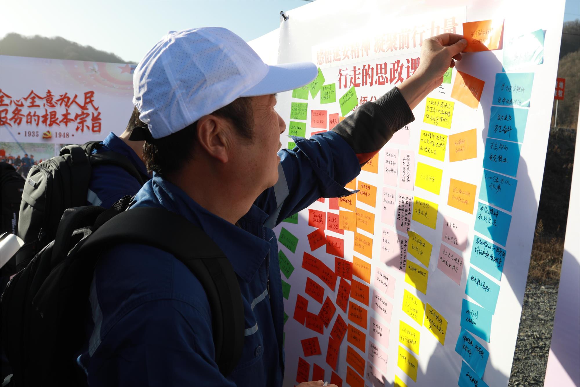 行至終點(diǎn),研討交流拉開帷幕,大家紛紛拿起便簽紙,抒寫感悟、暢談心得……一陣陣激烈研討交流過(guò)后,展板上貼滿了干事創(chuàng)業(yè)的激情和立足崗位建新功的誓言。