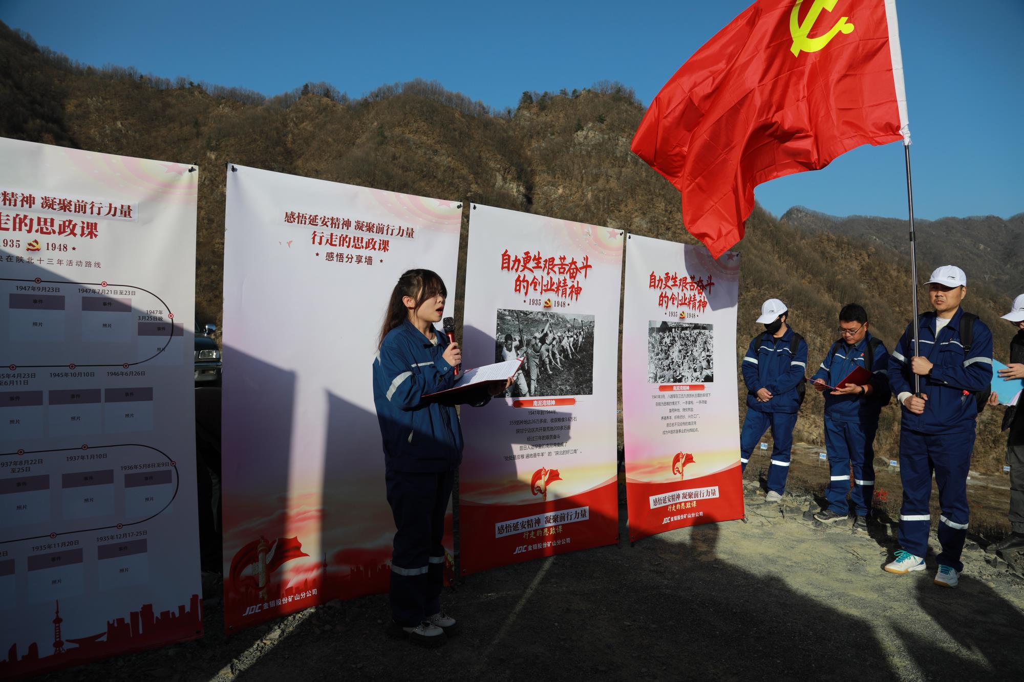 為確保思政課取得實(shí)實(shí)在在成效,金鉬集團(tuán)礦山分公司黨委提前籌劃,精心準(zhǔn)備,在總長(zhǎng)約6公里的木子溝尾礦庫(kù)沿途,設(shè)置4個(gè)集合點(diǎn),放置“堅(jiān)定正確的政治方向、解放思想實(shí)事求是的思想路線、全心全意為人民服務(wù)的根本宗旨、自力更生艱苦奮斗的創(chuàng)業(yè)精神”四塊紅色展板,通過(guò)場(chǎng)景模擬、現(xiàn)場(chǎng)講述等方式,系統(tǒng)回顧在百年黨史中熠熠生輝的延安精神,滋養(yǎng)初心、淬煉靈魂。