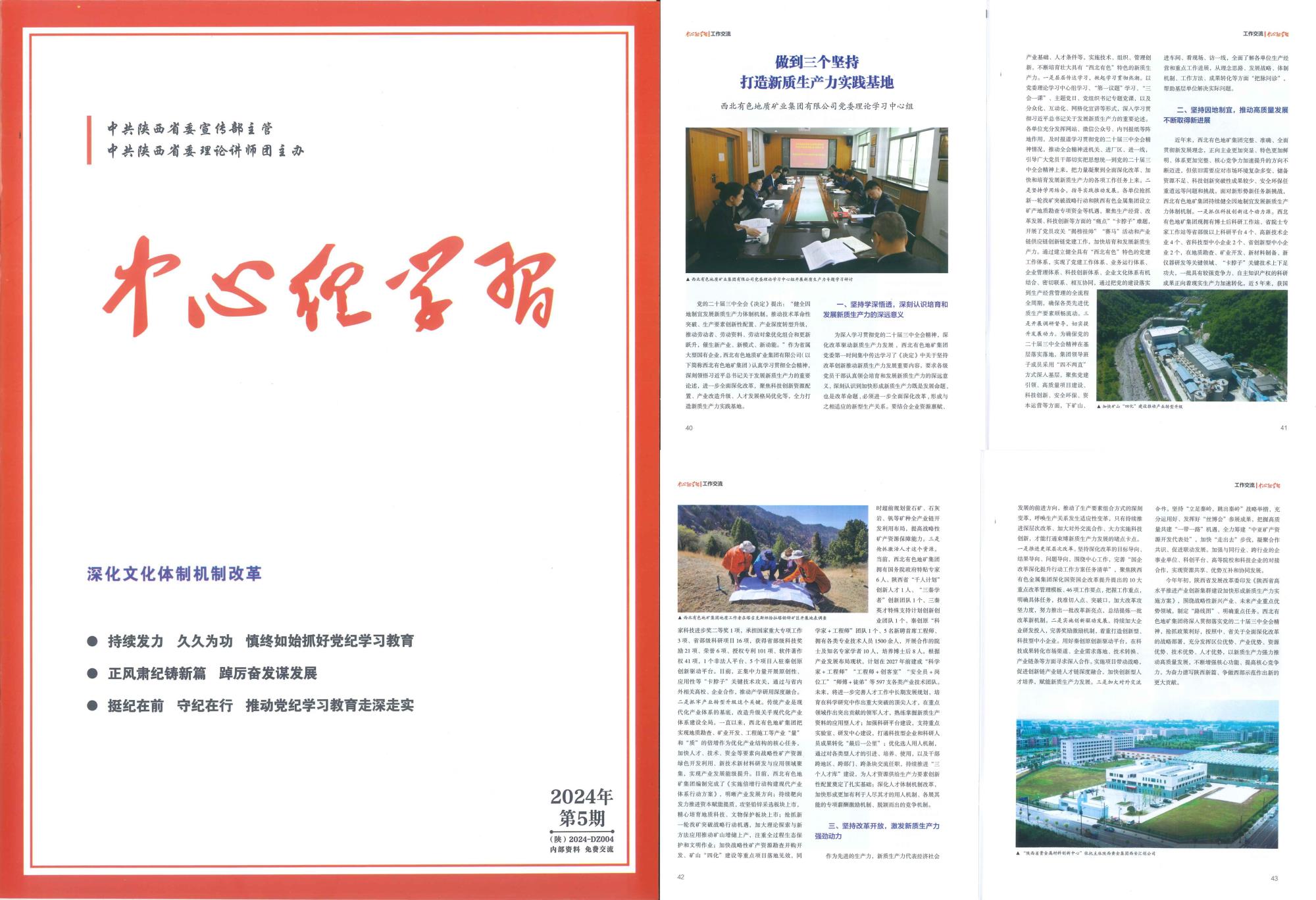 近日,由中共陜西省委宣傳部主管、中共陜西省委理論講師團(tuán)主辦的《中心組學(xué)習(xí)》雜志2024年第5期刊發(fā)地礦集團(tuán)黨委理論學(xué)習(xí)中心組署名文章《做到三個(gè)堅(jiān)持 打造新質(zhì)生產(chǎn)力實(shí)踐基地》,宣傳推介兩集團(tuán)深入學(xué)習(xí)貫徹黨的二十屆三中全會(huì)精神,聚焦科技創(chuàng)新資源配置、產(chǎn)業(yè)改造升級(jí)、人才發(fā)展格局優(yōu)化等,全力打造新質(zhì)生產(chǎn)力實(shí)踐基地的做法和成效。