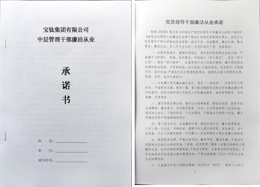 廉政談話結束后,寶鈦集團紀委還向新任職干部發(fā)放了《寶鈦集團有限公司中層管理干部廉潔從業(yè)承諾書》,要求新任職干部分別進行紙質(zhì)版、電子版承諾書和個人廉政檔案的填寫,為新任職干部建立廉政檔案。