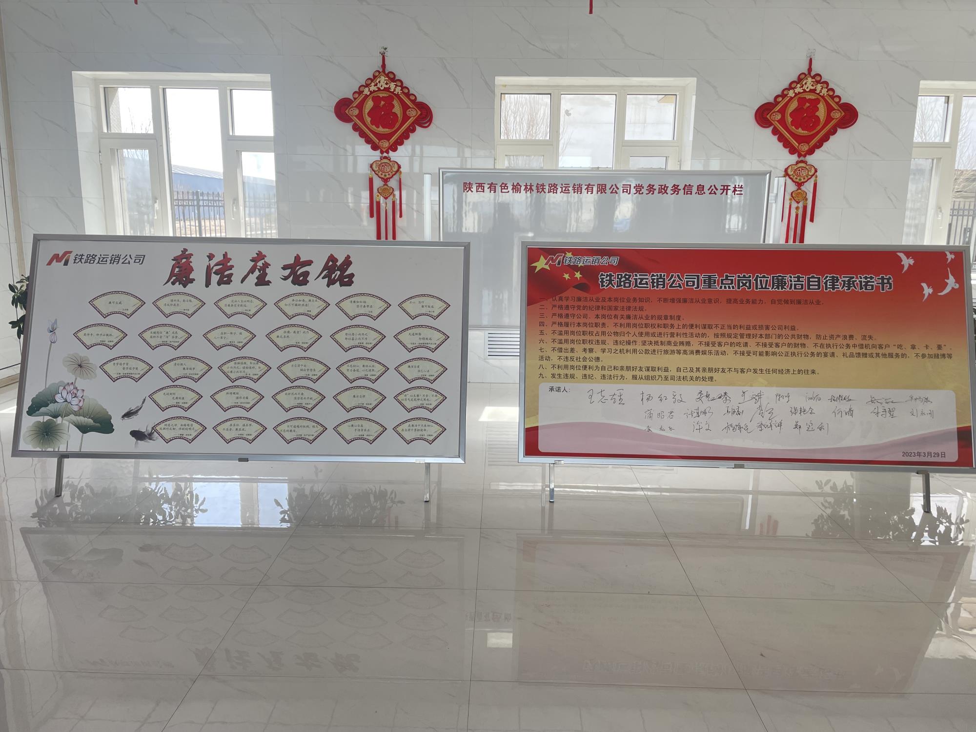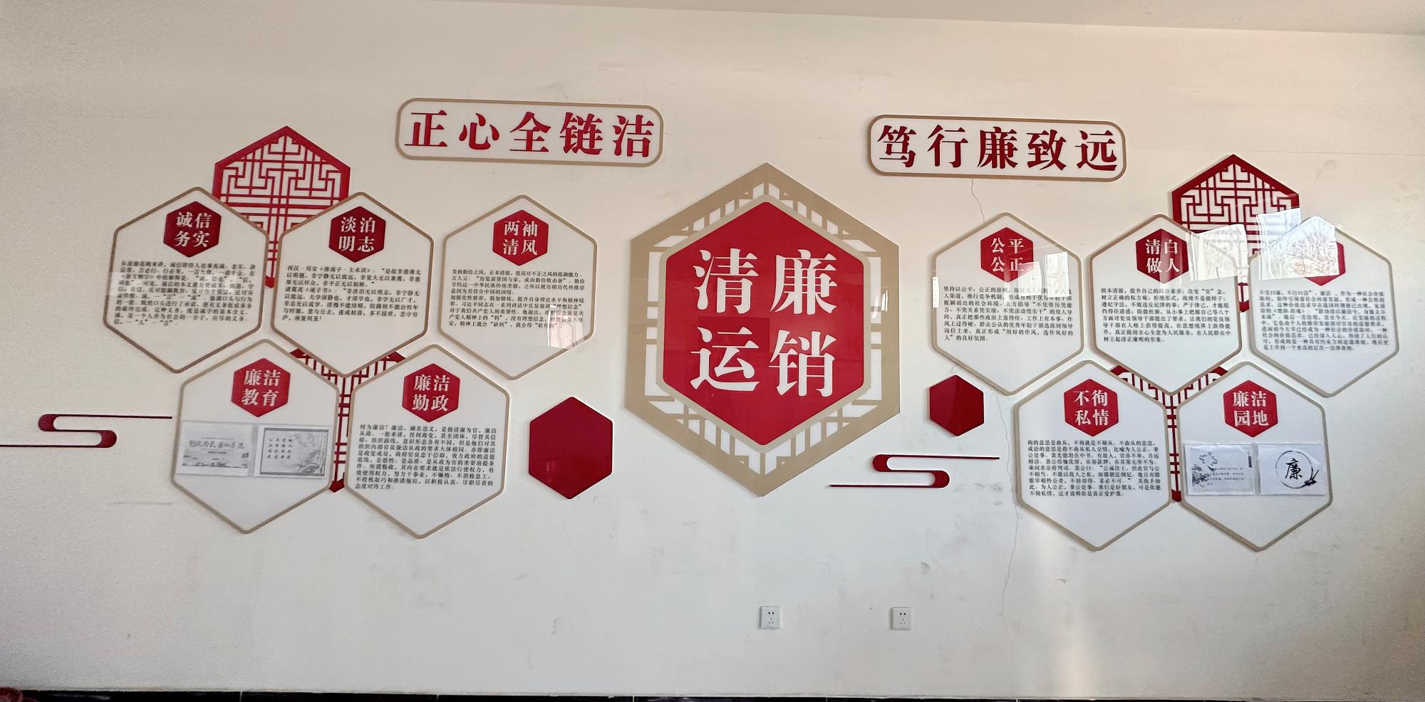 鐵路運(yùn)銷公司充分利用辦公樓、生產(chǎn)區(qū)域等地,打造廉潔清風(fēng)碑、廉潔文化宣傳欄、廉潔文化長(zhǎng)廊、廉潔文化墻4處廉潔文化陣地。其中廉潔文化長(zhǎng)廊,以榆林新材料集團(tuán)廉潔文化核心理念“正心全鏈潔、篤行廉致遠(yuǎn)”為主題,涵蓋公司廉潔文化建設(shè)目標(biāo)、管理理念、廉潔文化落地等11項(xiàng)內(nèi)容;廉潔文化墻以“學(xué)習(xí)教育”為主題,內(nèi)容涵蓋兩袖清風(fēng)、不徇私情等8項(xiàng)內(nèi)容。通過(guò)廉潔文化陣地建設(shè),不斷筑牢黨員干部拒腐防變的思想防線,真正做到將廉潔理念、廉潔文化融入日常,引導(dǎo)黨員干部夯實(shí)廉潔從政思想道德根基,營(yíng)造風(fēng)清氣正的良好工作氛圍。