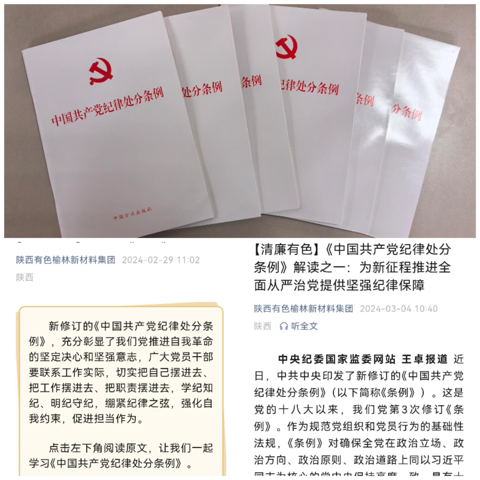 新修訂的《中國共產(chǎn)黨紀(jì)律處分條例》印發(fā)以來,榆林新材料集團(tuán)紀(jì)委始終把學(xué)習(xí)貫徹《條例》作為一項重要政治任務(wù)和深入貫徹落實二十屆中央紀(jì)委三次全會精神及十四屆省紀(jì)委三次全會精神的重要舉措,切實發(fā)揮職能作用,主動做學(xué)習(xí)貫徹《條例》的實踐者、推動者、監(jiān)督者。